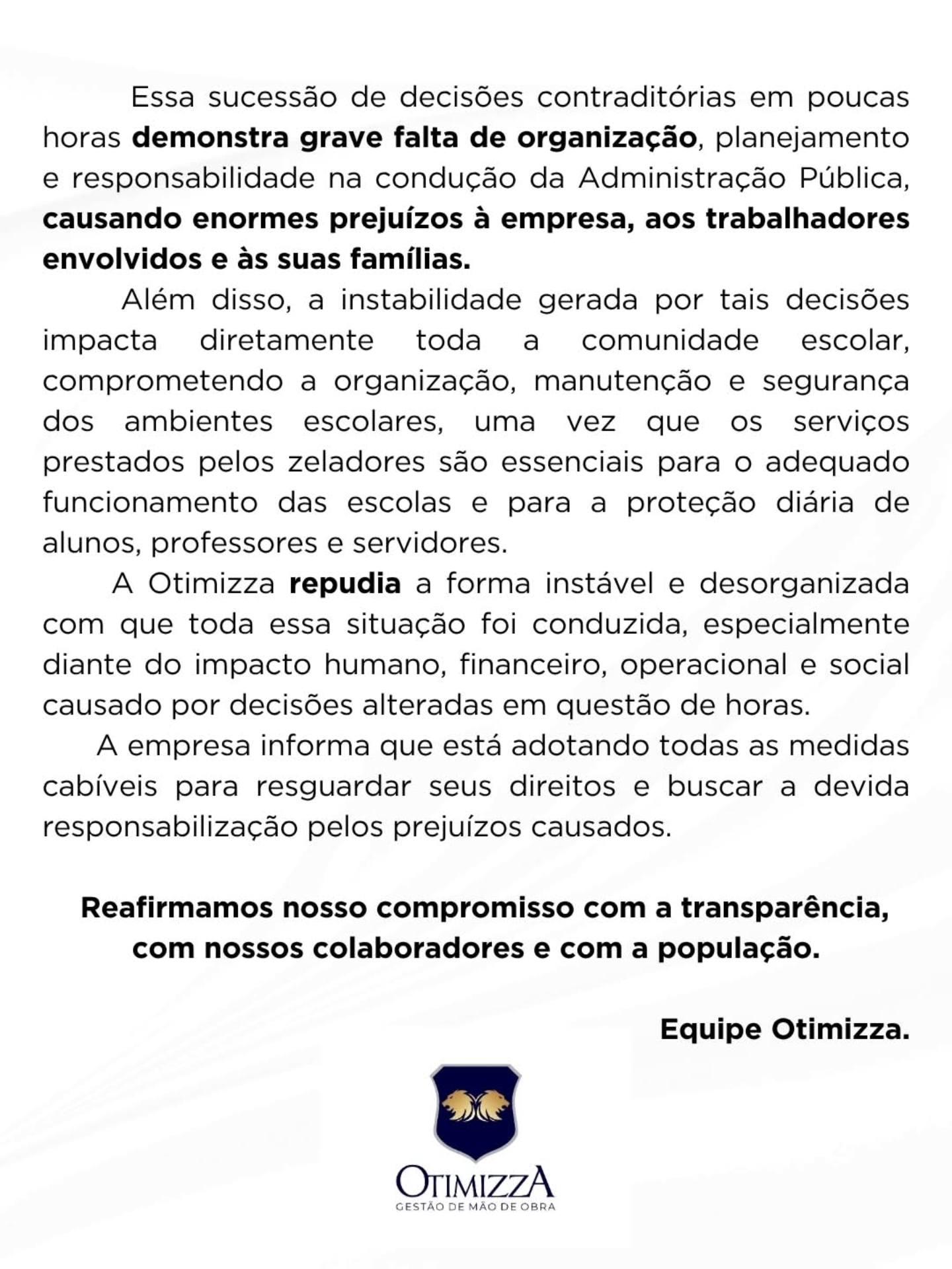 A empresa Otimizza Soluções em Segurança divulgou, na data de 11 de abril, uma nota de esclarecimento a respeito da prestação do serviço de zeladoria nas escolas do município de Guaporé.
